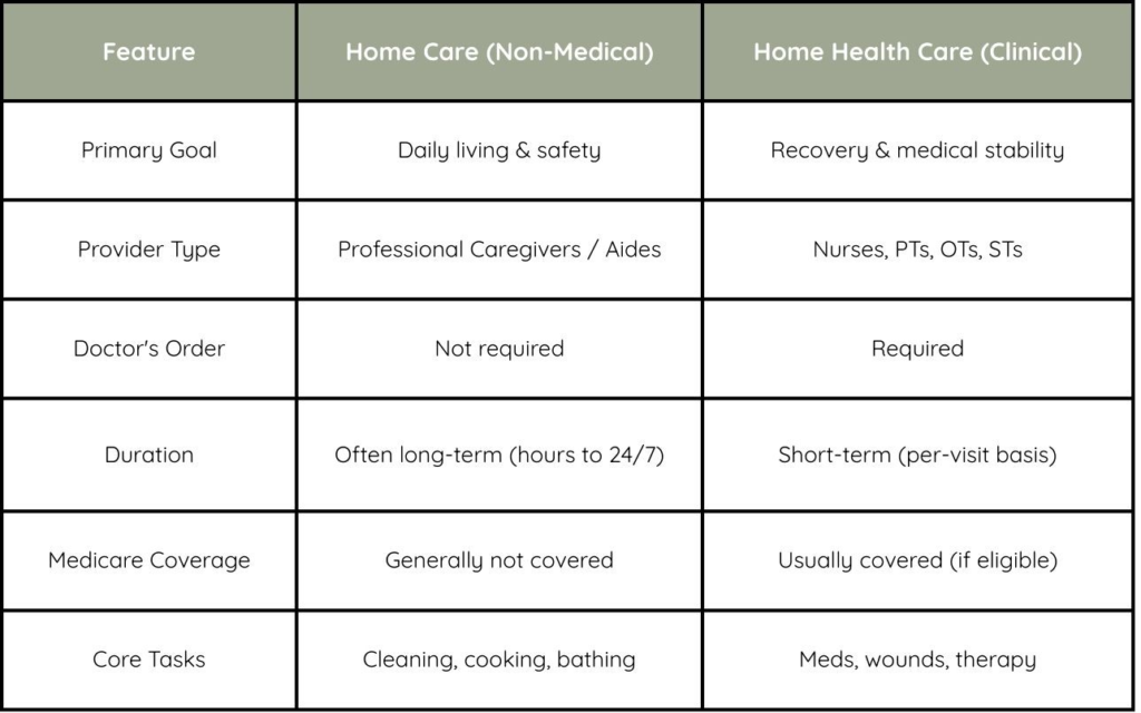 Home health care is significantly different because it is medical in nature. Think of it as an extension of the hospital or a doctor’s office brought directly to the living room. These services are typically “short-term” and aimed at treating a specific illness or injury.
